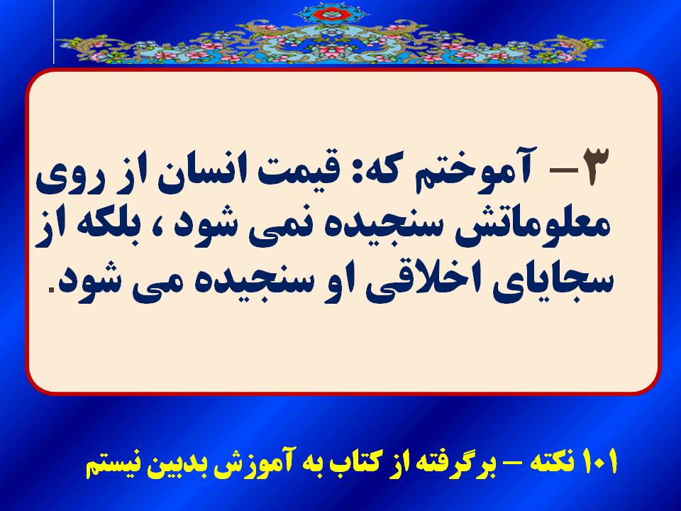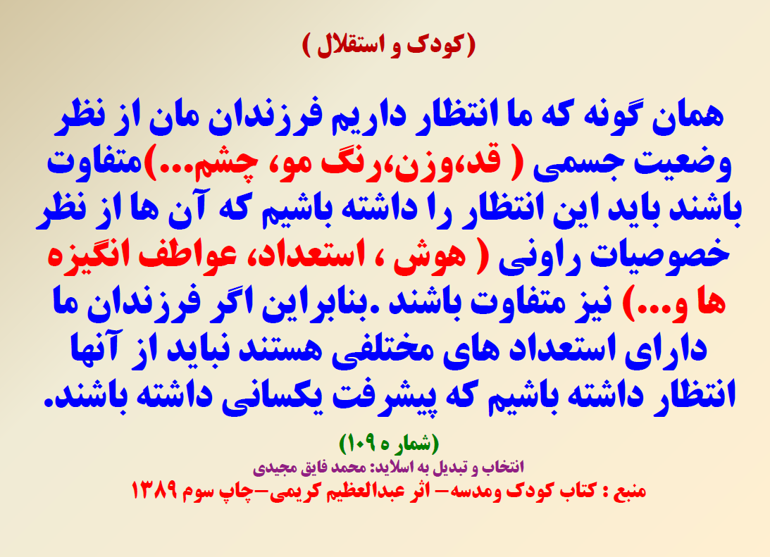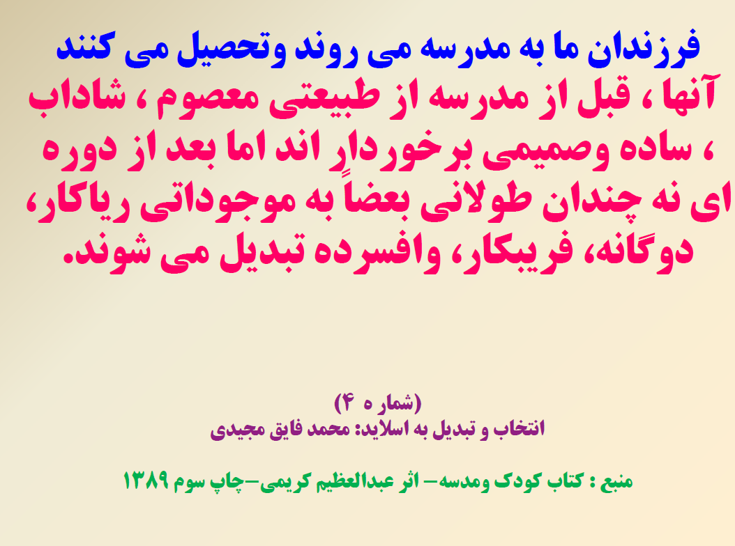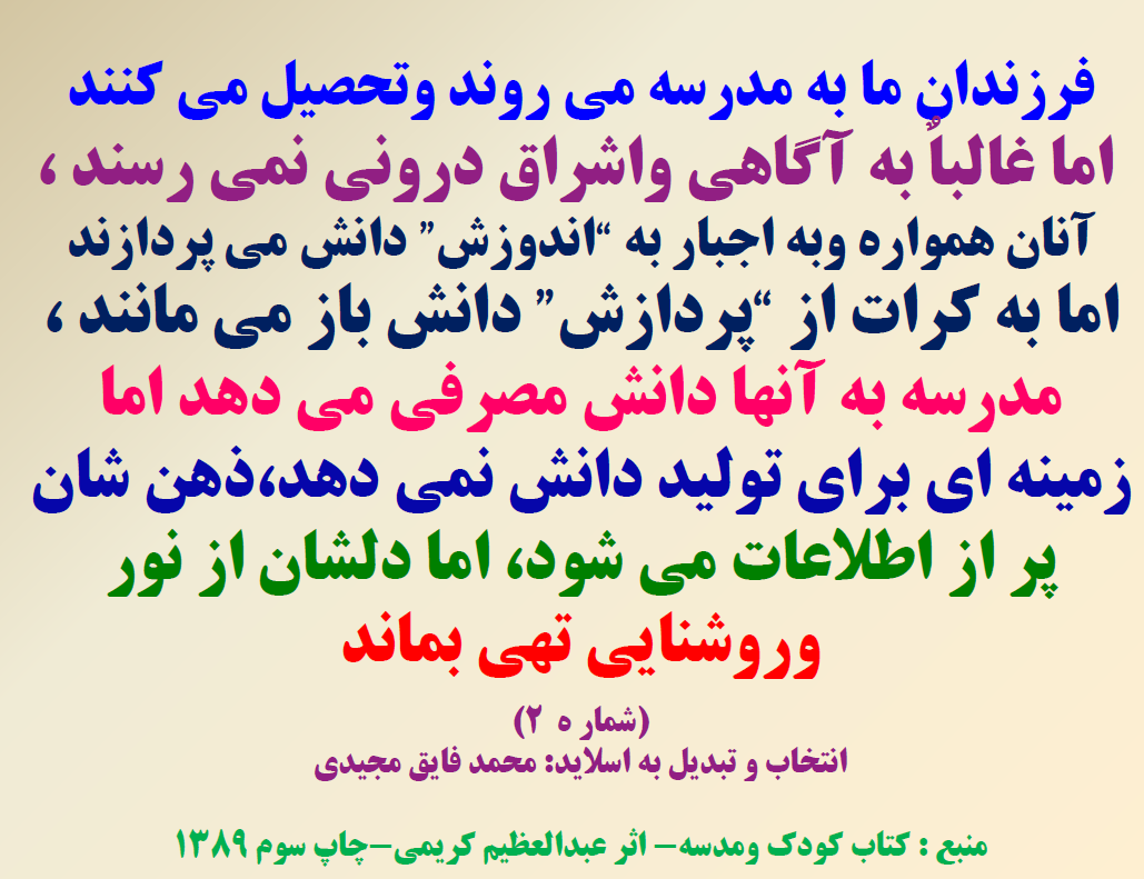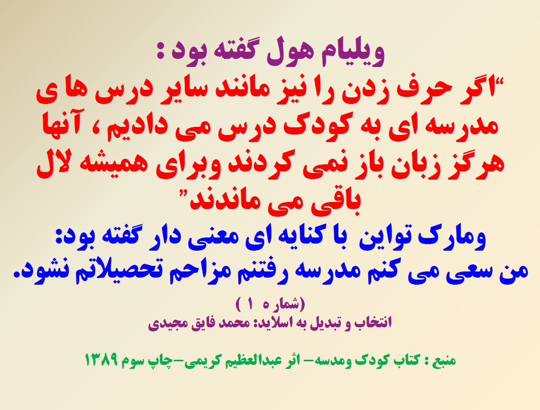 -گاهی اوقات اموزش های غلط وروش های ناشیانه در مدرسه باعث می شود درهای جهان پیرامون ، به روی ذهن دانش اموزان بسته شود در حالی که طبیعت جهان خارج بهترین مدرسه برای اموزش وتربیت ذهنی وشخصیت کودکان است .